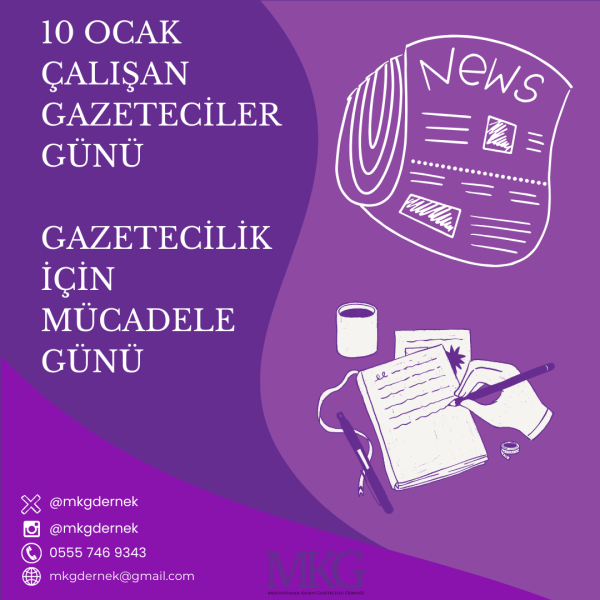 28-01-2025Mezopotamya Kadın Gazeteciler Derneği (MKG) olarak, 10 Ocak Çalışan Gazeteciler Günü’nde bir kez daha haykırıyoruz: Kadın gazeteciler susturulamaz, Özgür Basın teslim alınamaz! 2024...